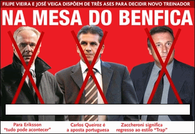 Que enorme vontade de rir eu tive, quando o Benfica apresentou o novo treinador sem ninguém "pescar" quem seria até ao último momento. Uma enorme risada para os ridículos jornalistas desportivos que temos no nosso país, não só do Record mas também dos outros jornais e telvisões. O Jogo, por exemplo, apresentou na 5ª feira os " três ases" na mesa do Benfica: Eriksson, Queiroz e Zaccheroni. O Record batia insistentemente em Eriksson. E o melhor ficou para bem perto do fim, quando a SIC notícias avançou que Carlos Queiroz já tinha chegado a acordo com o Benfica - recorde-se que chegaram mesmo a escrever: O contrato, válido por duas épocas, foi celebrado ontem à noite, num hotel de Lisboa. Agora imaginem as gargalhadas que Luís Filipe Vieira não deve ter dado! Ah ah ah... Enfim, é com enorme gozo que verifico que já acabou o tempo em que havia fugas de informação no Benfica. Pura e simplesmente não se sabe. E tudo o que surge é pura ESPECULAÇÃO! Apenas e só MAU JORNALISMO!